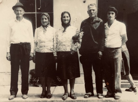 6. Mamaia Florica cu nea Iancu si nea Noane; de la stanga la dreapta: nea Iancu, tusa Anica, mamaia Florica, nea Noane si Misu; nu stiu in ce an este facuta fotografia